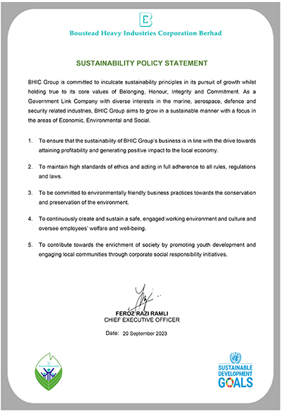 As a Government Linked Company, a listed entity and a major player in Malaysia’s marine, defence and security sectors, BHIC is very much aware of its responsibility to conduct its business in a sustainable manner for its own benefit and for the interest of its stakeholders and the economy, environment and society in which it operates.